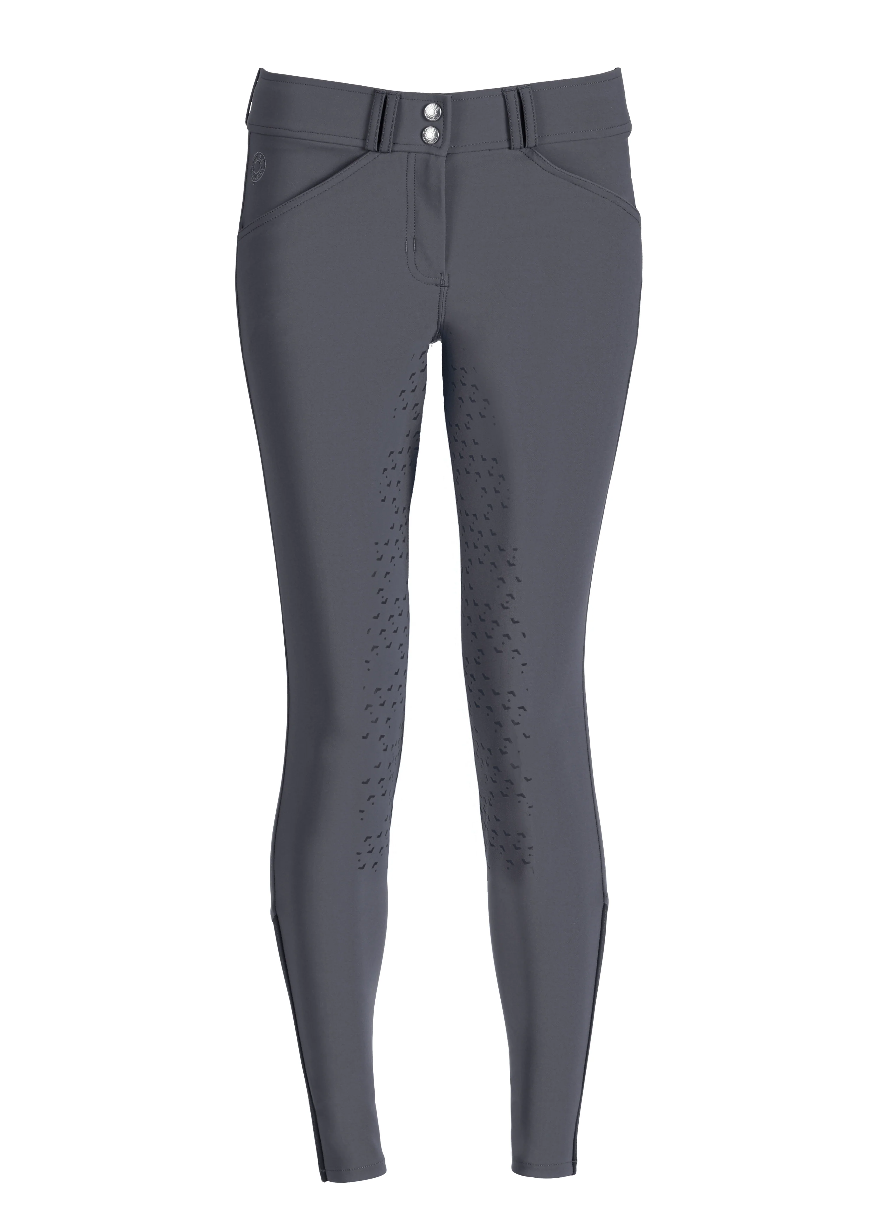 Single-layer, high-stretch calf panels provide a custom fit, eliminate bulk inside boots and allow easy on/off. Front slash pockets and functional back pockets are made of low-profile stretch material for a no-show appearance on the outside and enhanced comfort on the inside. The silicone print full seat features a stylish equestrian design that provides flexible grip.